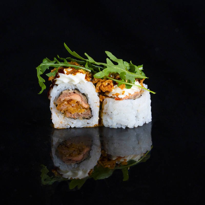 Salmón frito, Philadelphia, teriyaki, salsa de sésamo, cebolla frita, rúcula